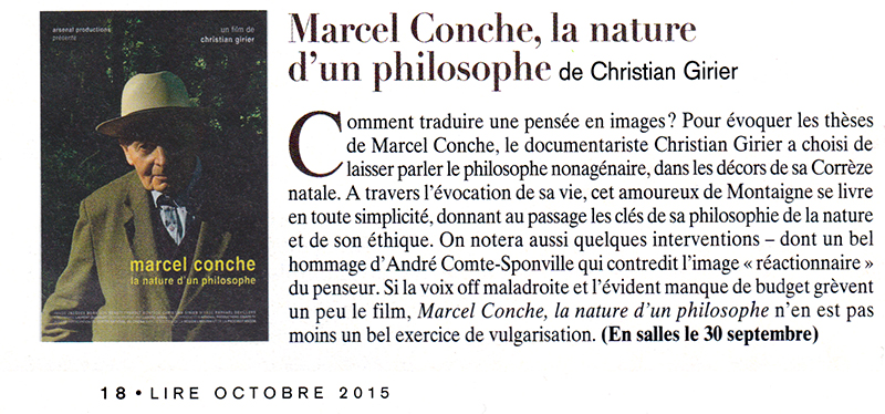 J’ai beaucoup aimé ce film parce que je le trouve véridique et humain. Marcel Conche a gardé son sens de l’émerveillement et le lien avec la nature. On sent une forme de spiritualité, au sens d’être relié à l’univers, qui dépasse le rationnel.